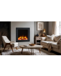 The Asencio with Noir fascia, featuring a smooth matte black finish, adds a touch of modern elegance to any room. This glass-fronted wall inset electric fire creates a minimalist yet striking feature fireplace that comes with Smart connection capability and innovative technology. The fuel effect consists of realistic natural flames, and authentically designed woodland logs placed over glowing under-bed embers.