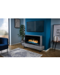 The contemporary rustic steel legs gives the fireplace a wall mounted appearance. The integrated Eco Design electric fire features an authentic log bed with optional decorative transparent slate. Enjoy up to 2kW of heat output or simply use the flame effect for a welcoming glow. Also, thanks to the clever ‘smart remote’, you’re in control of a range of functions. Set a daily or 7-day timer, adjust the heat with the integrated thermostat or use the ingenious ‘draft feature’, which turns the heat off if a sudden drop in room temperature is detected, saving energy.